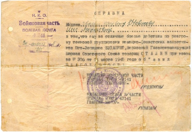 Как свидетельствуют архивные документы: «После госпиталя был выписан в 200-й запасной полк, откуда назначили в 253-й гвардейский зенитный артполк. Участвовал в освобождении Правобережной Украины, Молдавии, Румынии, Югославии, Венгрии, Австрии в составе 3-го Украинского фронта». Товарищ Новиков И.Л. участвовал в боях за взятие г. Будапешта, о чем подтверждает справка с благодарностью Верховного Главнокомандующего маршала Советского Союза товарища Сталина, а также во взятии г. Вены.