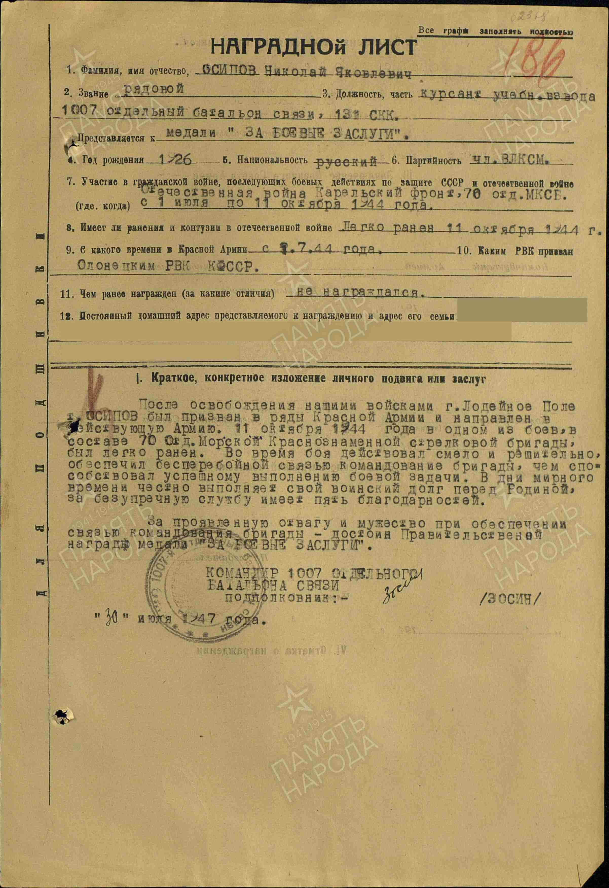 После этого тяжелейшего похода бригада была отведена на отдых в Грязовец Вологодской области. Здесь 11 ноября 1944 года Николай Яковлевич получил свою первую награду – медаль «За оборону Советского Заполярья». Вскоре бригада была переформирована в лёгкую горнострелковую.