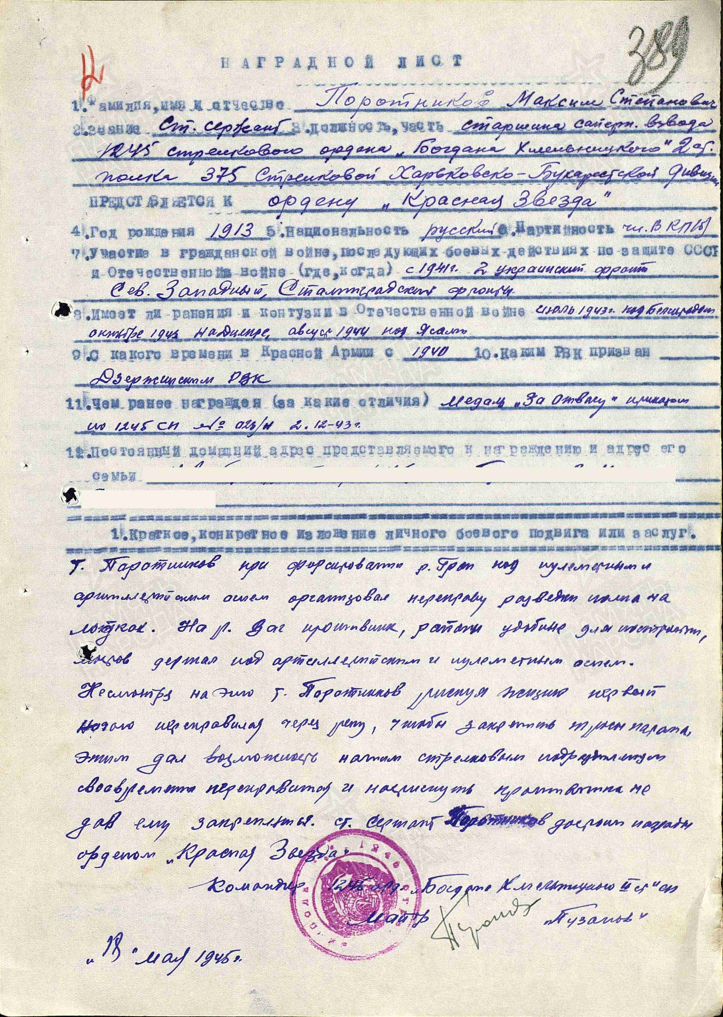 В мае 1945 г. награжден орденом Красной Звезды.