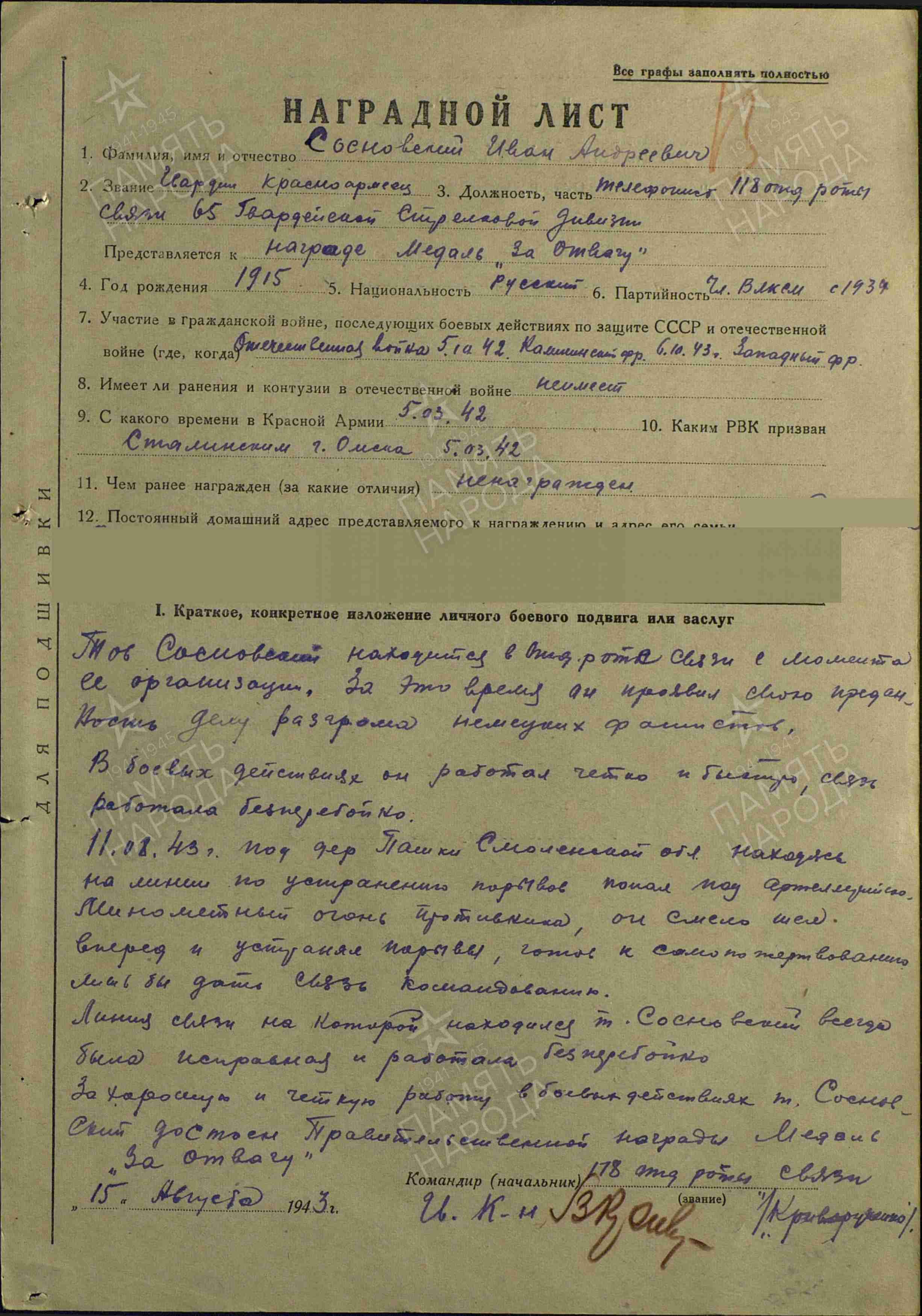 22 августа 1943 г. приказом № 10/н по 65 Гвардейской стрелковой дивизии был награжден медалью «За отвагу». Из наградного листа И.А. Сосновского: «Тов. Сосновский находится в отдельной роте связи с момента ее организации. За это время он проявил преданность делу разгрома немецких фашистов. В боевых действиях он работал четко и быстро, связь работала бесперебойно. 11.08.1943 под деревней Пашки Смоленской области, находясь на линии по устранению порывов, попал под артиллерийский минометный огонь противника, он смело шел вперед, устраняя порывы, готов к самопожертвованию, лишь бы дать связь командованию. Линия связи, на которой находился тов. Сосновский, была исправна и работала бесперебойно. За хорошую и четкую работу в боевых действиях тов. Сосновский достоин Правительственной награды – медали «За отвагу»».