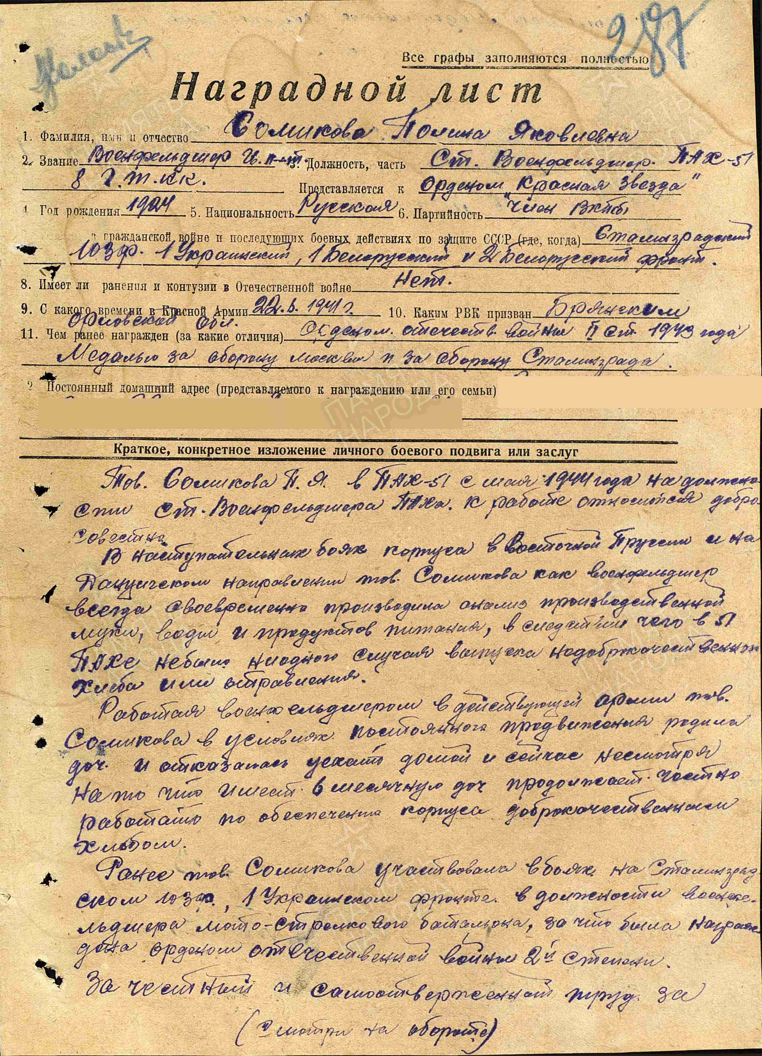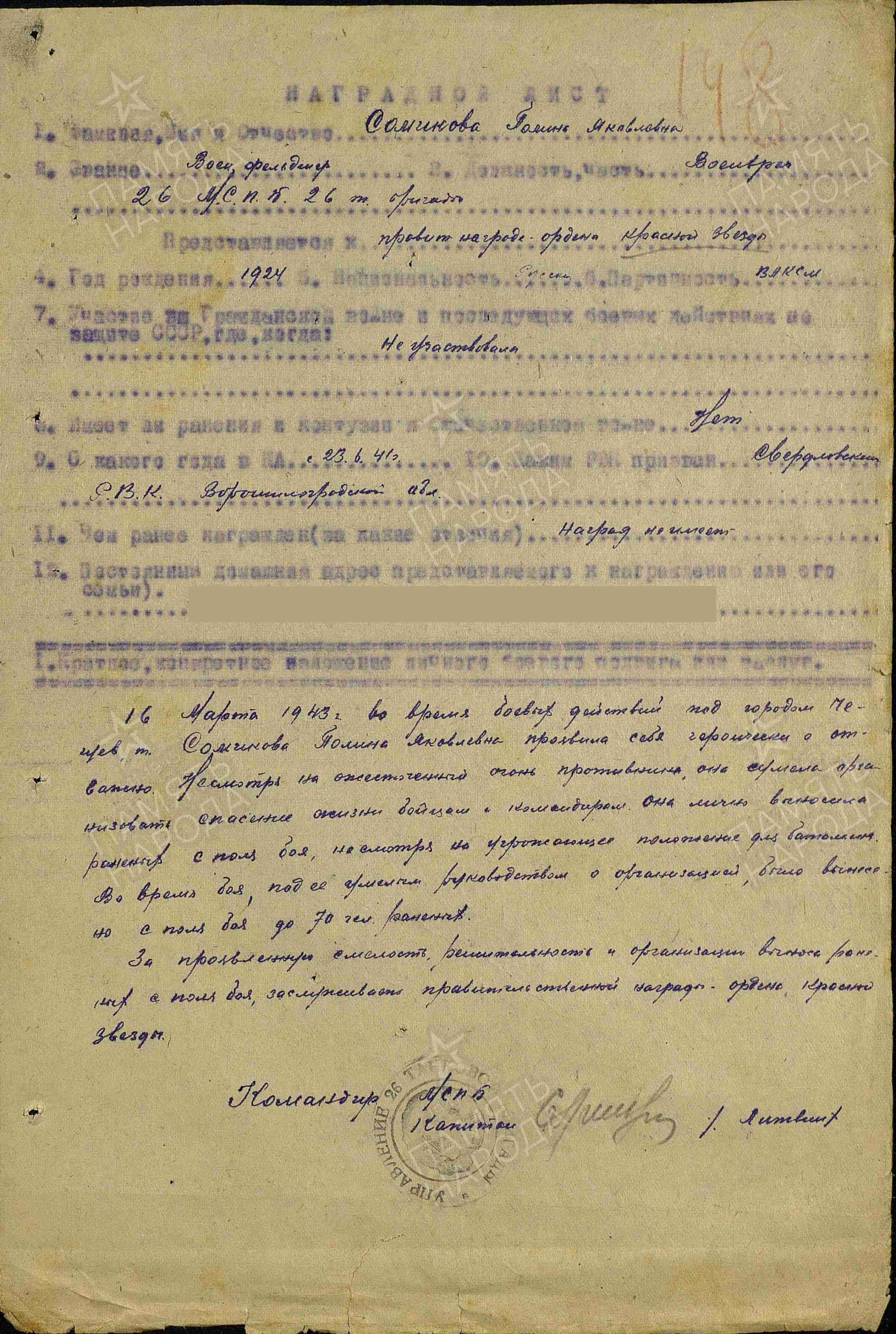 «За трое суток непрерывной бомбежки город был превращен фашистами в обгоревшие руины. Служила я во 2-м танковом корпусе санинструктором. Наш корпус занимал оборону недалеко от тракторного завода. Отдельные подразделения корпуса зарылись в берег Волги. Все мы хорошо знали – отступать некуда. Госпитали наши находились на левом берегу Волги в Ленинске. Раненых мы переправляли в основном с пяти до шести часов утра, когда наступала относительная передышка. Дело это было нелегкое. Переправы, баржи все время обстреливали, бомбили, поэтому раненых часто приходилось перевозить на лодках и небольших плотах. Вода ледяная. Течение мощное, сносит. Это захватывало нас, медиков, целиком, и об опасности мы не думали. Работать приходилось так много, что забывали о сне…