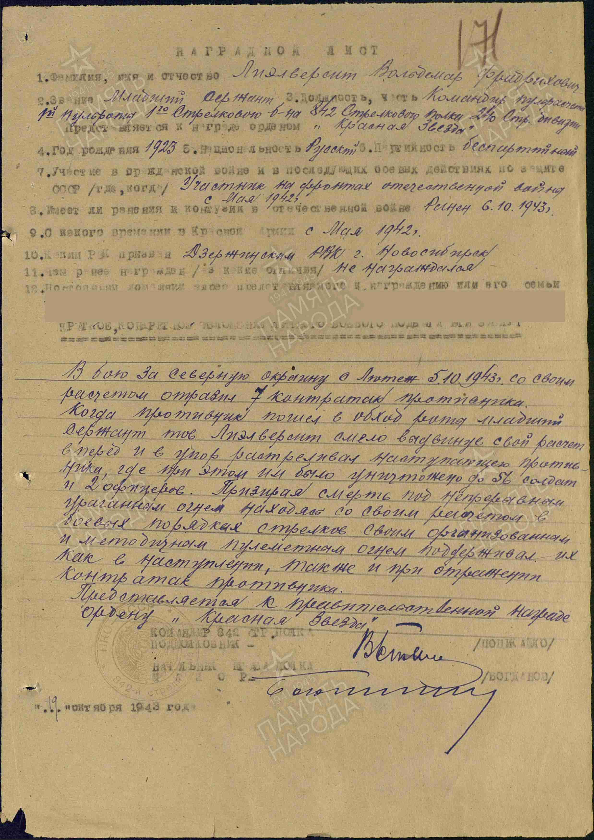 Приказом № 034/н по частям 240-й стрелковой дивизии 38-й армии Воронежского фронта от 23.10.1943 г. за образцовое выполнение боевых заданий командования на фронте борьбы с немецкими захватчиками и проявленными при этом доблесть и мужество младший сержант Лиэлверсит Вольдемар Фридрихович, командир пулеметного расчета 1-й пулеметной роты 842-го стрелкового полка, был награжден орденом Красной Звезды.