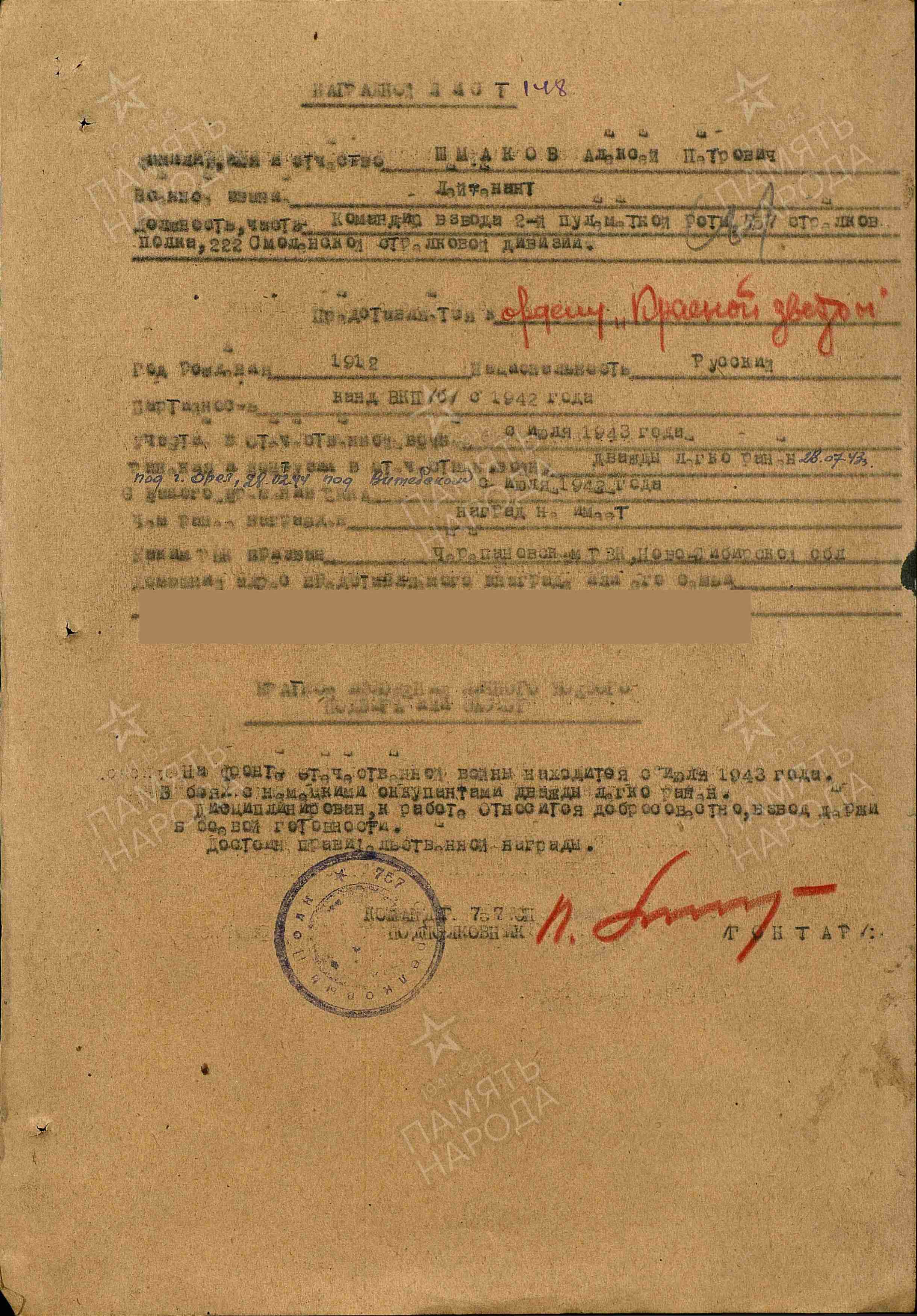 Первый орден Красной звезды был вручен 27.04.1944 года. Из наградного листа: «На фронте Отечественной войны находится с июля 1943 года. В боях с немецкими оккупантами дважды легко ранен. Дисциплинирован, к работе относится добросовестно, взвод держит в боевой готовности. Достоин Правительственной награды».