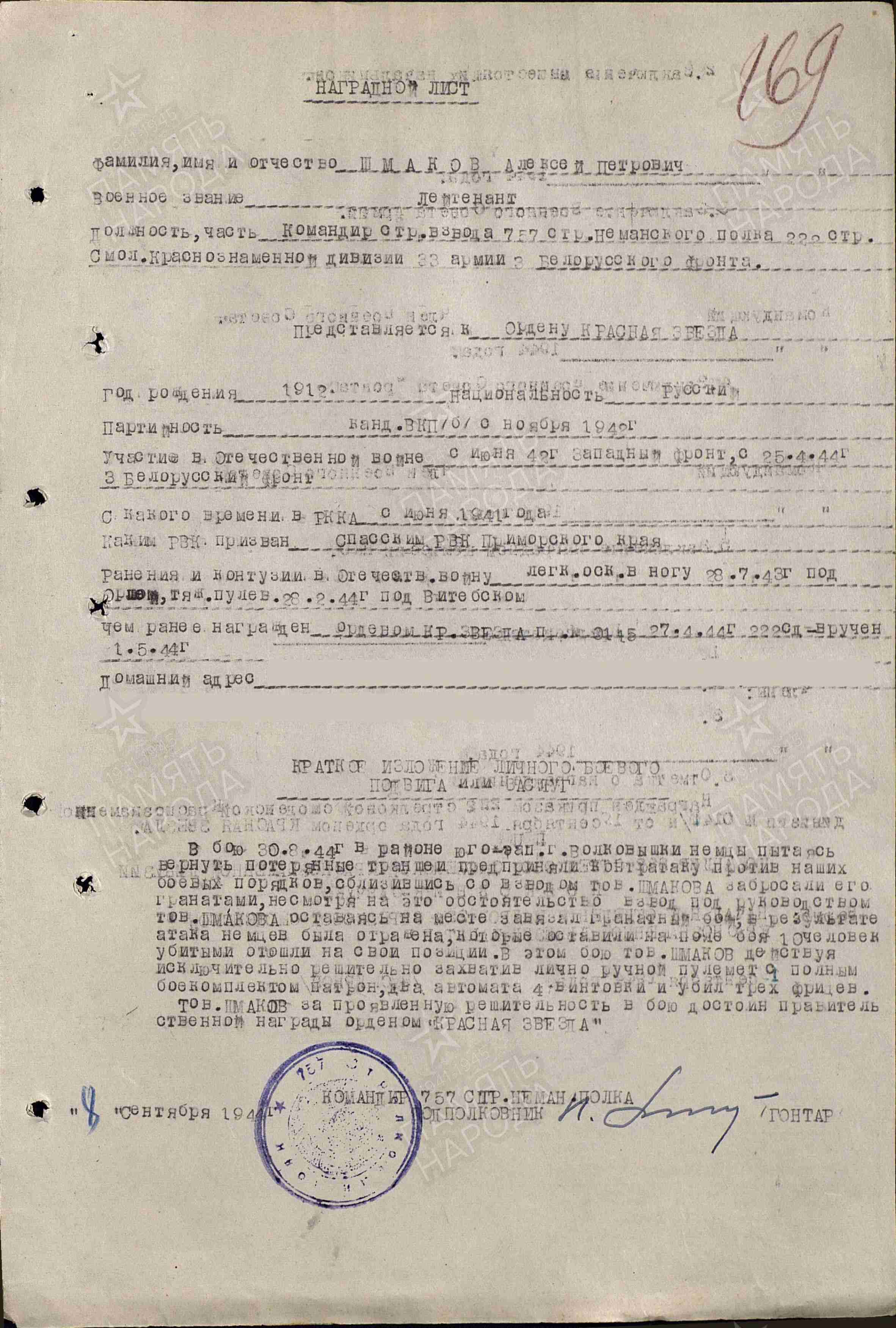 15.09.1944 г. А.П. Шмаков награжден вторым орденом Красной Звезды. Из наградного листа: «В бою 30.08.44 г. в районе юго-западнее г. Волковышки немцы, пытаясь вернуть потерянные траншеи, предприняли контратаку против наших боевых порядков, сблизившись со взводом тов. Шмакова забросали его гранатами. Несмотря на это обстоятельство, взвод под руководством тов. Шмакова, оставаясь на месте, завязал гранатный бой, в результате атака немцев была отражена, оставив на поле боя 10 человек убитыми, они отошли на свои позиции. В этом бою тов. Шмаков, действуя исключительно решительно, захватил лично ручной пулемет с полным боекомплектом патрон, два автомата, 4 винтовки и убил 3 фрицев. Тов. Шмаков за проявленную решительность в бою достоин Правительственной награды ордена «Красной Звезды»».