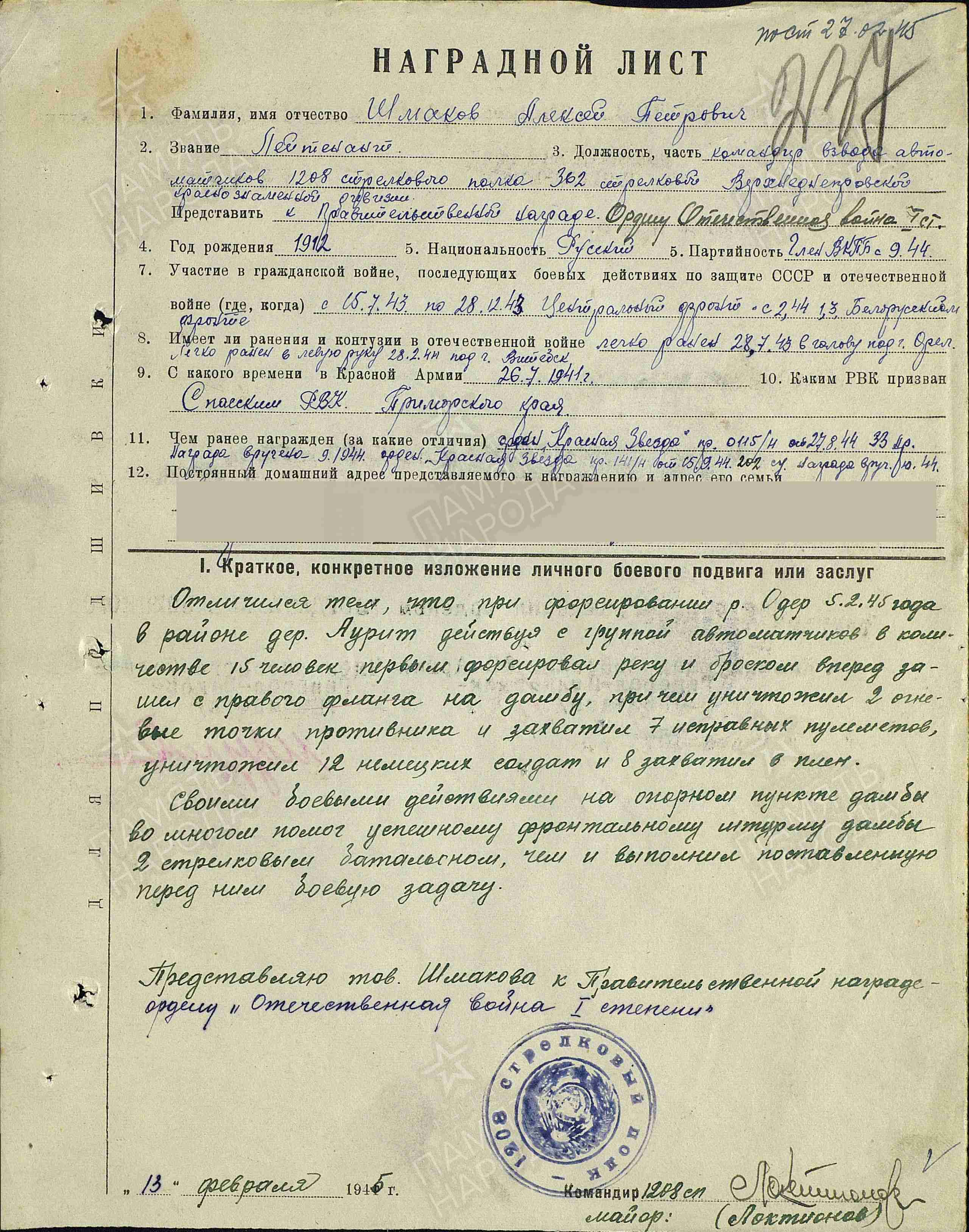 13.02.1945 г. боевые заслуги А.П. Шмакова были отмечены Орденом Отечественной войны I степени. Из наградного листа: «Отличился тем, что при форсировании р. Одер 05.02.45 г. в районе дер. Аурит, действуя с группой автоматчиков в количестве 15 человек, первым форсировал реку и броском вперед зашел с правого фланга на дамбу, причем уничтожил 2 огневые точки противника и захватил 7 исправных пулеметов, уничтожил 12 немецких солдат и 8 захватил в плен. Своими боевыми действиями на дамбе во многом помог успешному фронтальному штурму дамбы 2 стрелковым батальоном, чем и выполнил поставленную перед ним задачу. Представляю т. Шмакова к Правительственной награде – ордену Отечественной войны I степени».