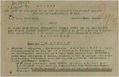 С июля 1944 года дивизия в составе 83-го стрелкового корпуса 4-й Ударной армии 2-го Прибалтийского фронта принимала участие в освобождение Латвийской ССР. С 10 по 27 июля в ходе Режицко-Двинской операции дивизия освободила Краслава - 22 июля и Двинск (Даугавпилс) - 27 июля. За умелые действия в боях за овладение городом Двинск, дивизия получила благодарность Верховного Главнокомандующего, а 1193-му стрелковому полку было присвоено почётное наименование «Двинский».