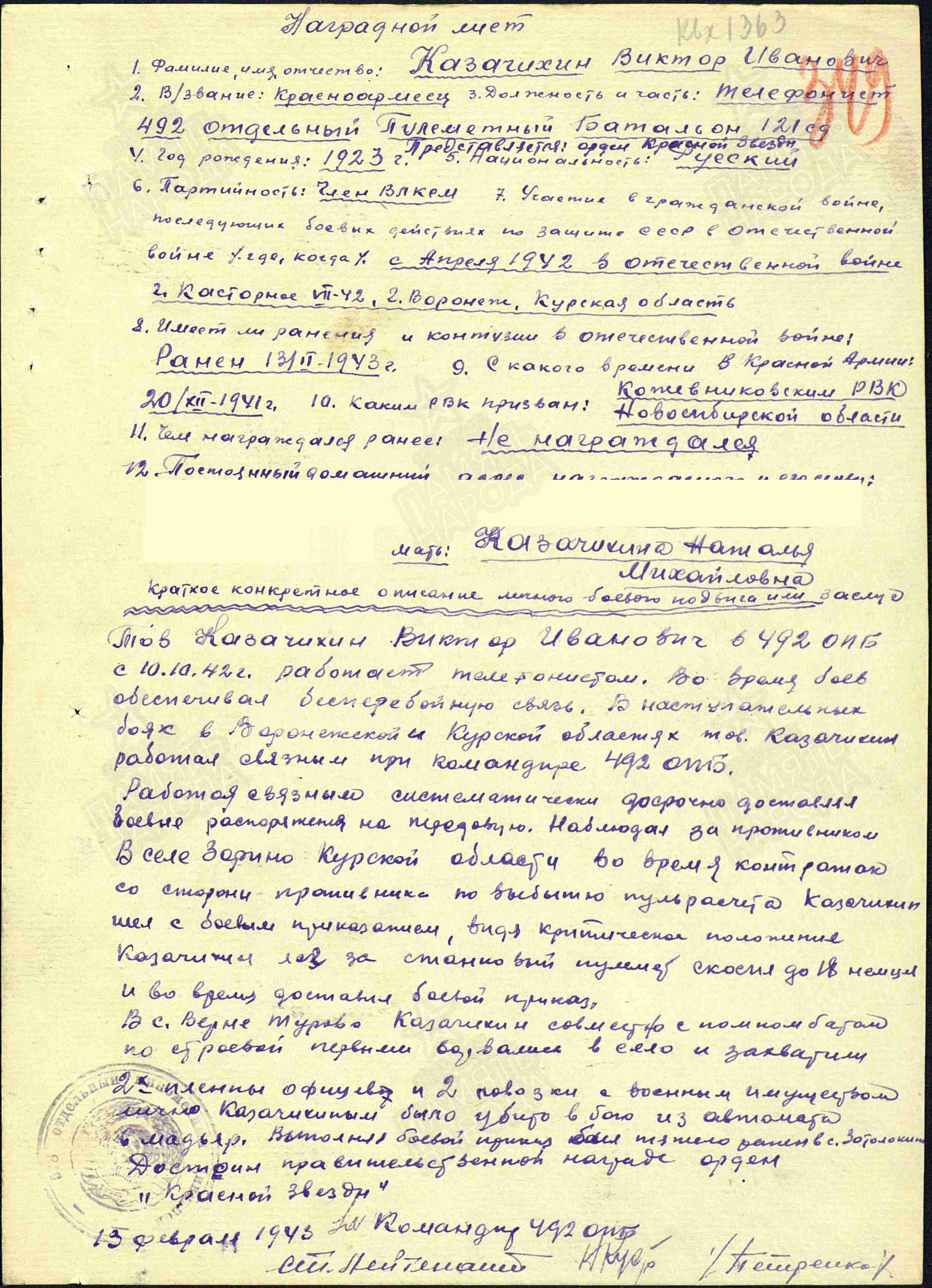 Из наградного листа: «Работая связным, систематически досрочно доставлял боевые распоряжения на передовую. Наблюдал за противником. В селе Зорино Курской области во время контратак со стороны противника по выбытию пульрасчета Казачихин шел с боевым приказанием. Видя критическое положение, Казачихин лег за станковый пулемет, скосил до 18 немцев и вовремя доставил боевой приказ. В селе Верхне-Турово Казачихин совместно с помкомбатом по строевой первым ворвались в село и захватили двух пленных офицеров и две повозки с военным имуществом лично. Казачихиным было убито из автомата 6 мадьяр. Выполняя боевой приказ, 13 февраля 1943 г. был тяжело ранен в селе Зотолокино. Достоин правительственной награды – ордена Красной Звезды». Вместо ордена В.И. Казачихин был награжден медалью «За отвагу», особо уважаемой и ценимой среди фронтовиков, поскольку ею награждали исключительно за личную храбрость, проявленную в бою.