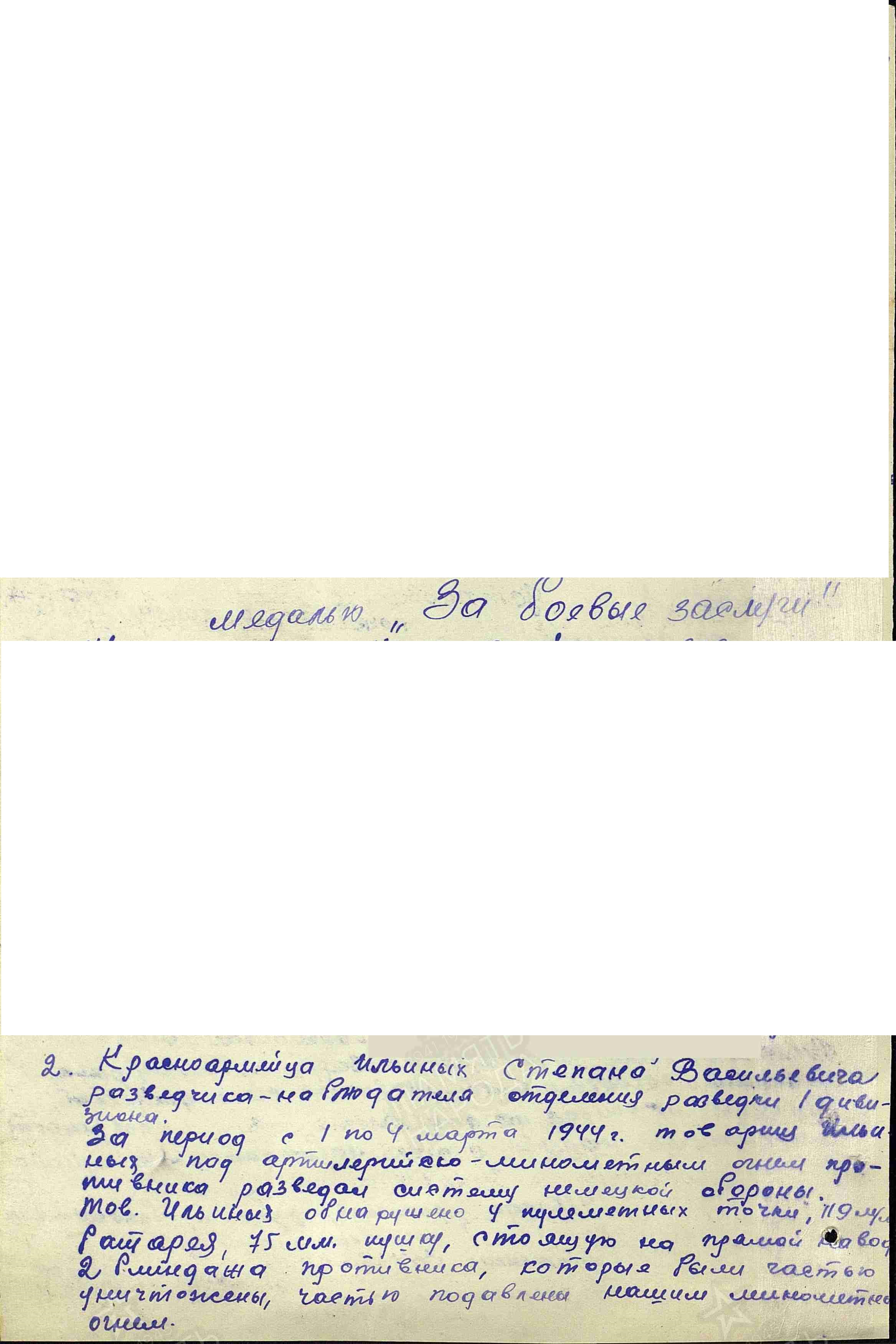 Из наградного листа медалью «За боевые заслуги»: «За период с 1 по 4 марта 1944 года товарищ Ильиных под артиллерийско-минометным огнем противника разведал систему немецкой обороны. Тов. Ильиных обнаружено 4 пулеметных точки, 119 мм батарея, 75 мм пушку, стоящую на прямой наводке, 2 блиндажа противника, которые были частью уничтожены, частью подавлены нашим минометным огнем».
